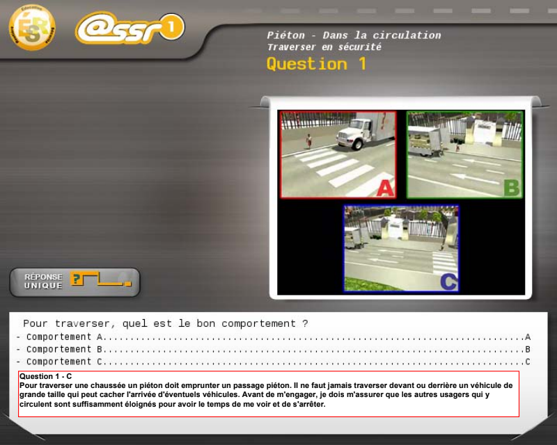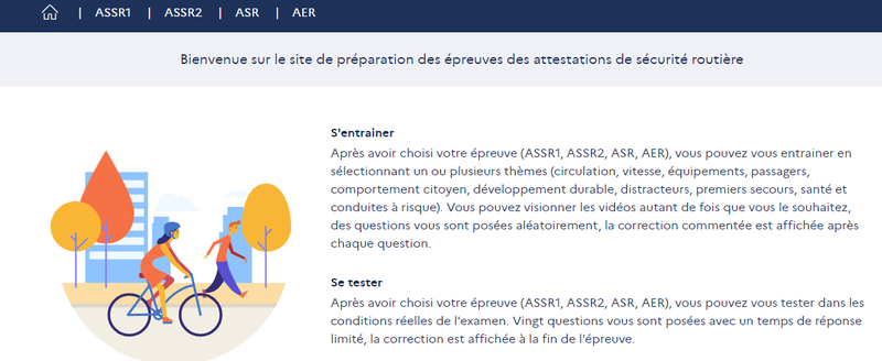 Après avoir choisi votre épreuve (ASSR1, ASSR2, ASR, AER), vous pouvez vous entrainer en sélectionnant un ou plusieurs thèmes (circulation, vitesse, équipements, passagers, comportement citoyen) , la correction commentée est affichée après chaque question.